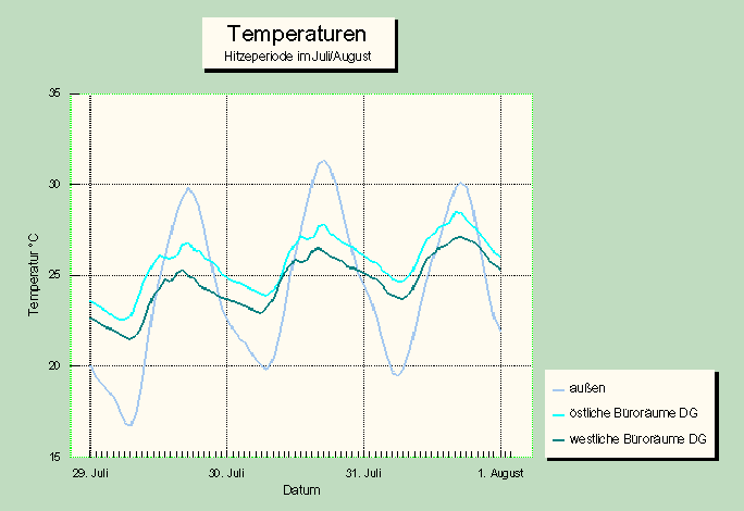 Außentemperatur am 30. Juli am höchsten. Die Innentemperaturen des