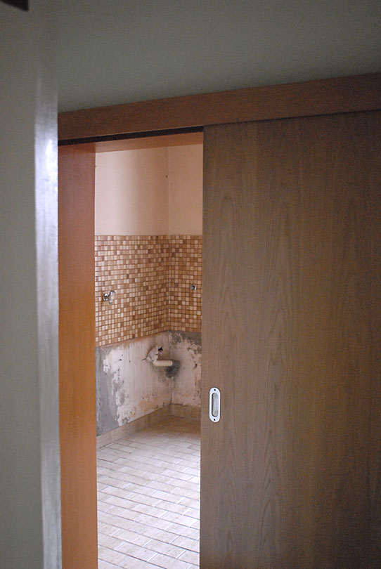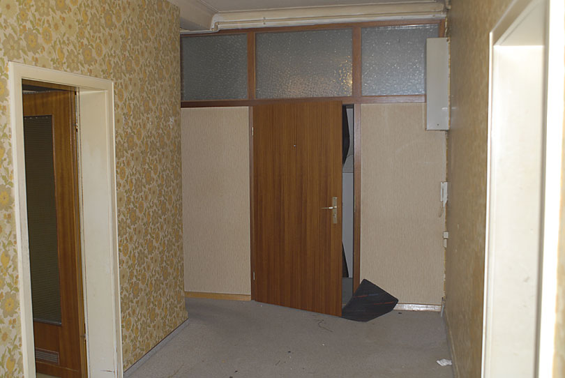 Die Situation in einer kleineren Wohnung: im Vordergrund erkennbar - die Schiebetüre ließ kein Licht in den Flur. Alles wirkt dunkel und beengt.