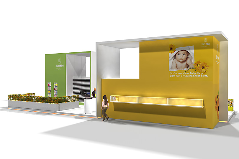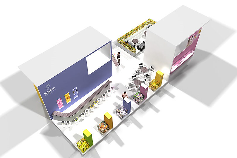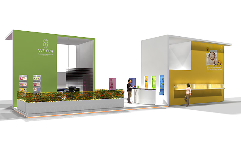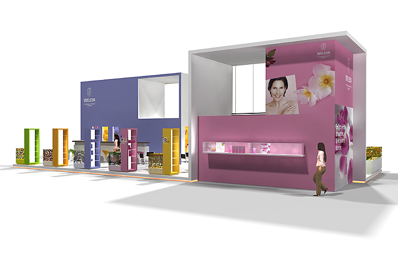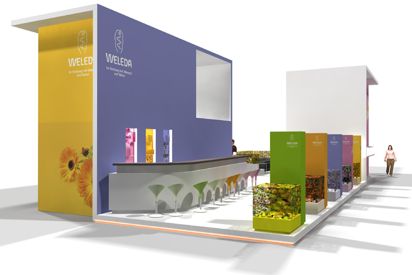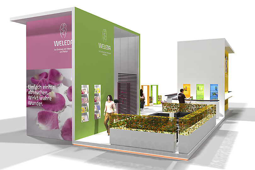 Aus dem zweidimensional bezogenen Marketingkonzept wird eine dreidimensionale Raumwelt gebildet, in der sich die gesamtheitliche Philosophie der Marke Weleda spiegelt.